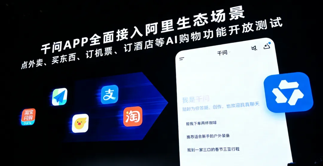 果然,1 月 15 日千问 APP 正式宣布全面接入淘宝、支付宝、淘宝闪购、飞猪、高德等阿里生态业务。用户无需跳转第三方应用,仅通过语音或文字指令,就能在千问 APP 内完成点外卖、购物、订票等真实场景的服务闭环。