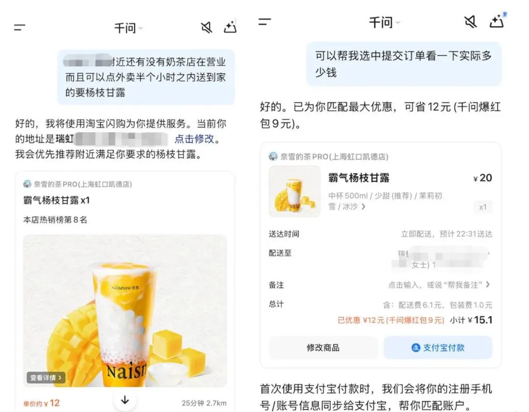 当时已是晚上 10 点多,不少茶饮店都已歇业,我决定让千问帮我点一杯奶茶。我告知它大概地址,明确要求推荐半小时内可送达的杨枝甘露。千问随即展示了我的详细地址,并精准推荐了25分钟可送达的奈雪的茶。同时完全按我的要求,清晰呈现了实付价、费用及优惠明细,其中“千问爆红包9元”还做了标红处理(特意提示这是渠道专享优惠)。