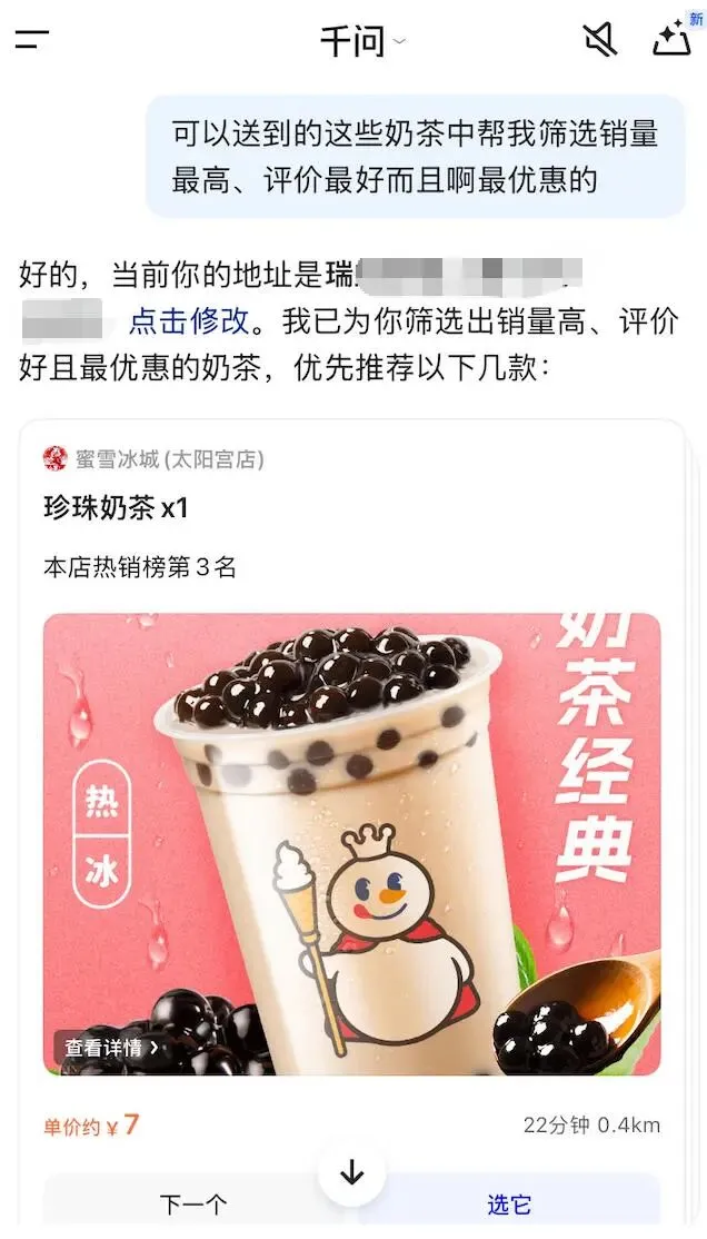 千问按需求推荐的奶茶店距离仅0.4公里,我后续去淘宝闪购核实发现,这家店销量高、评价好,还能快速送达,三个关键条件全部满足。