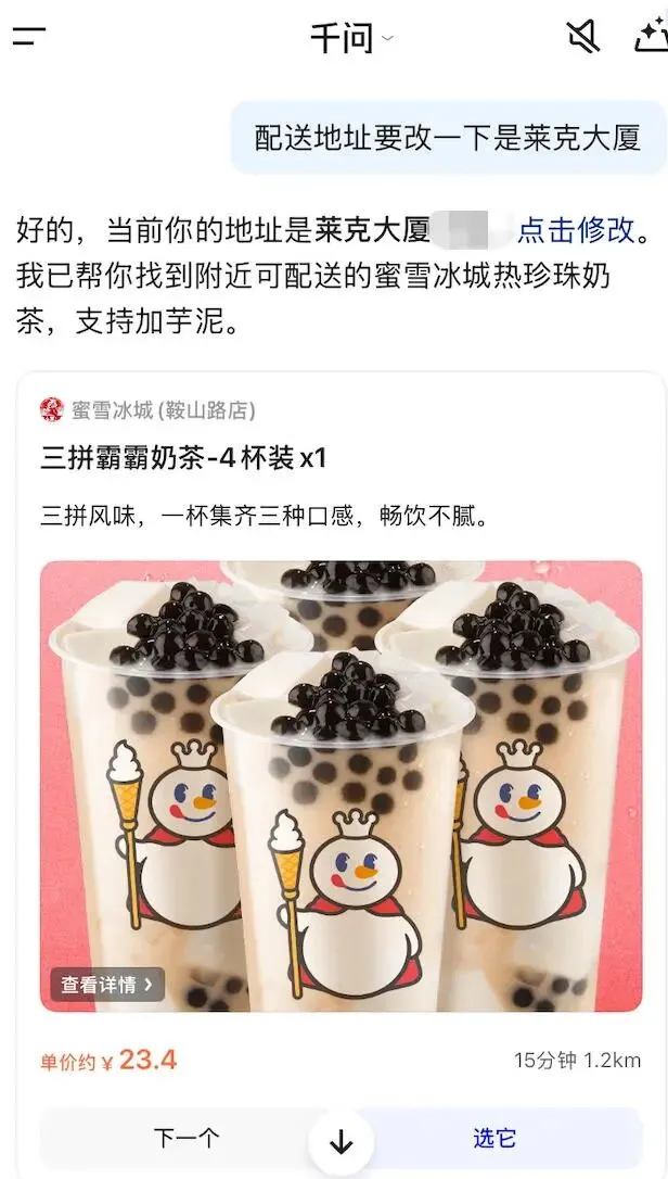 当我切换地址后,千问给我推荐了同品牌4杯装套餐奶茶,我纠正“只要一杯奶茶”,但千问仍继续推荐 4 杯装套餐,无法准确识别数量要求。