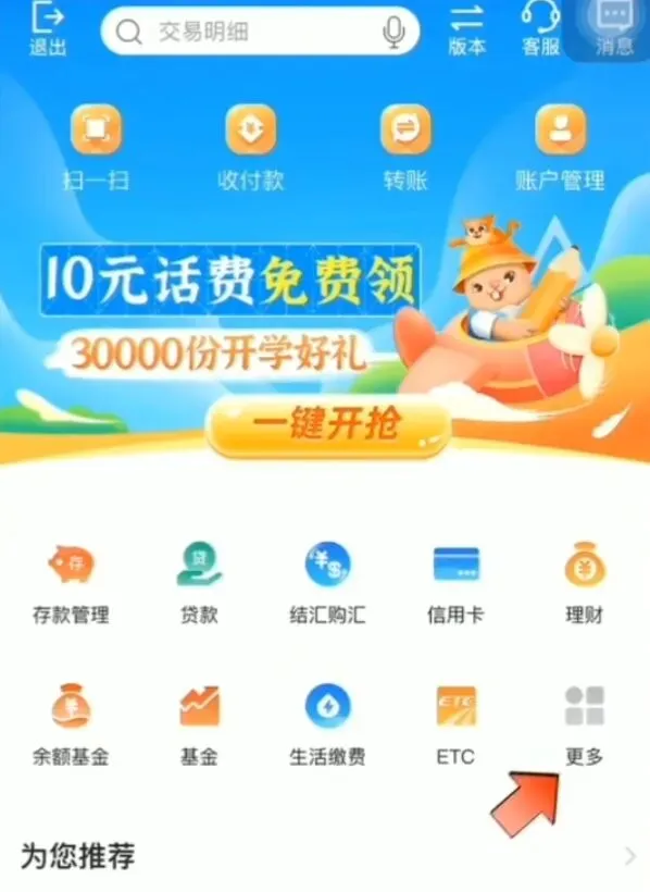手机银行APP首页点击【更多】下拉到最下面,选择【交易流水打印】。