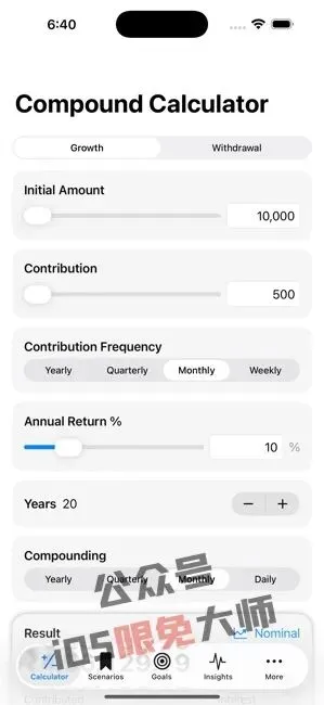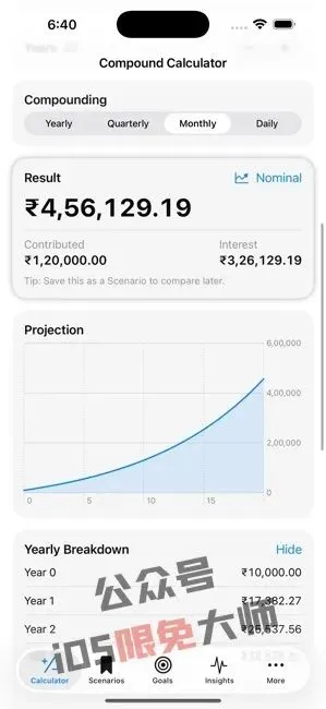 【Compound Interest Calculator】一款复利计算器,能让你清晰了解金钱随时间的增长情况。目前软件正在内购限免,获取时注意确认价格,手慢无!