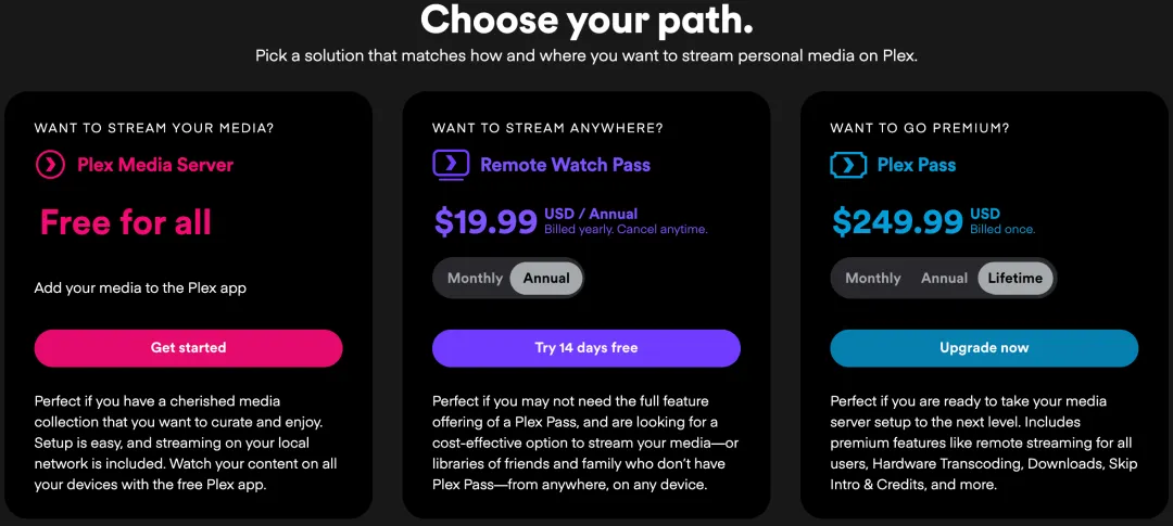 • 价格:基础功能免费,Plex Pass 订阅价格参考下图,没有远程观影需求的不订阅影响不大。 -