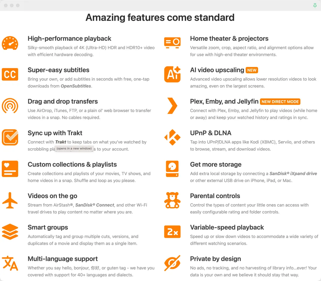 专为 Apple 生态打造的高颜值媒体播放器,以简洁优雅的设计和强大的播放能力,提供 iOS/macOS/tvOS 最佳观影体验。 -
