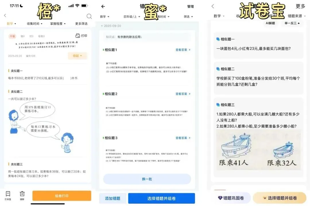 橙*和试卷宝表现都不错,有文字题和图片题,都有瑕疵但大部分能满意。蜜*就有点奇怪,每道相似题里面包含两个小题,而且前两题就是改了一下文字,数字都不带变的,感觉上有点敷衍了