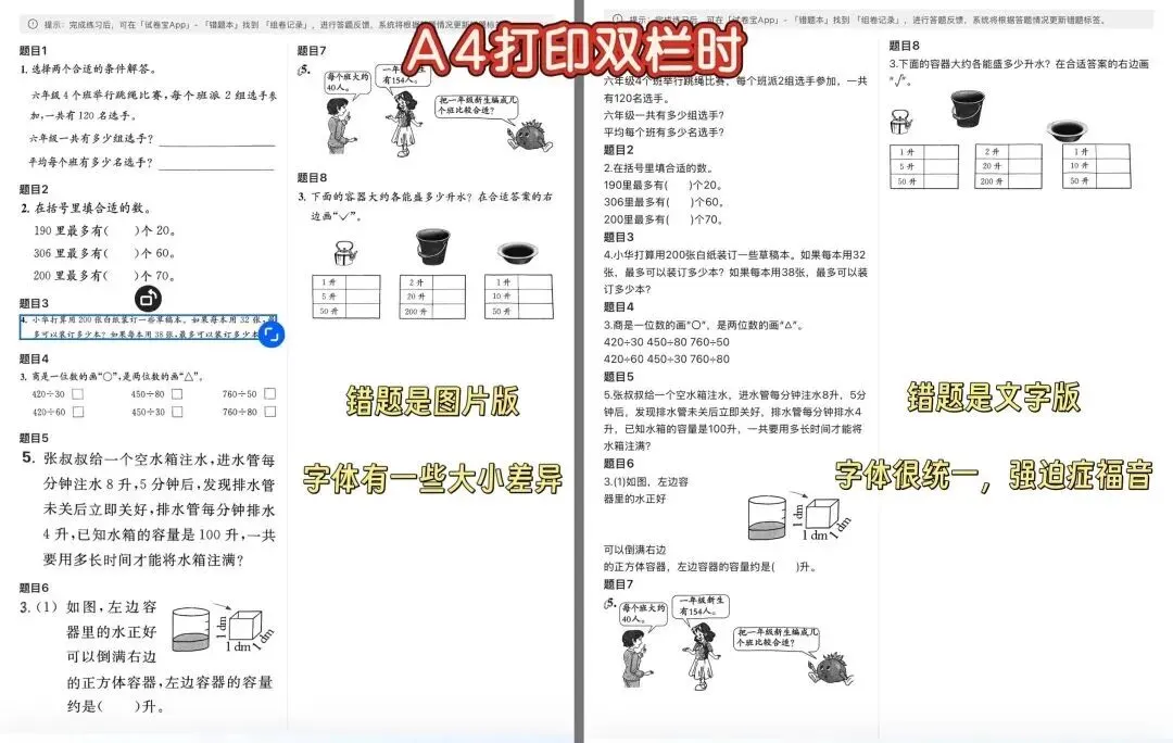 A:收集错题时如果是“图片形式”,字体是不可调整的,图片大小可以单张微调。在A4双栏打印模式可能会出现字体不等大的情况。如果追求极限一致的话,可以保存/修改错题为“文字形式”,这样可以做到大小统一,美观度大大提升!非常适合强迫症