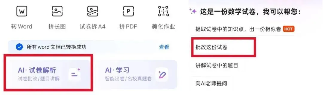 A:可以,批改作业的入口是“试卷解析”,拍照后选择“批改这份试卷”。