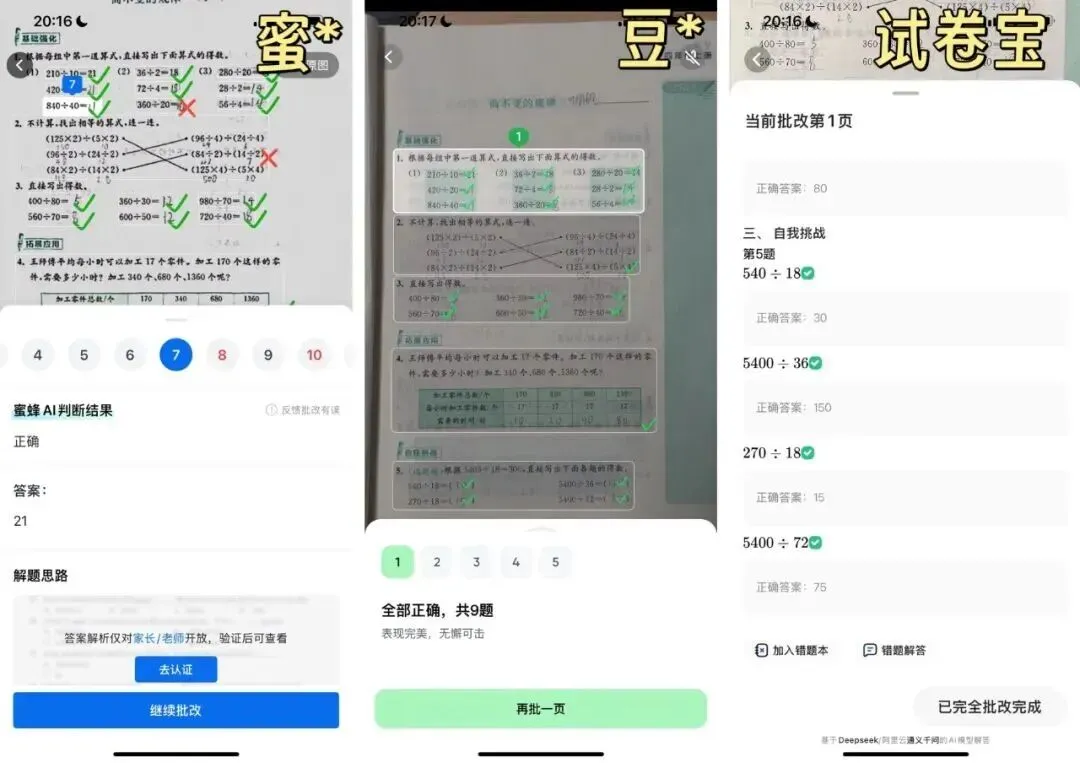 但目前所有大模型批作业都会产生一定比例的错漏,对这个功能的期待不要太高。虽然批作业不是它的“主业”,但我还是对比了一下。孩子的周末作业分别用三个软件批改,豆*和试卷宝都批改无误,蜜*有两题误批。
