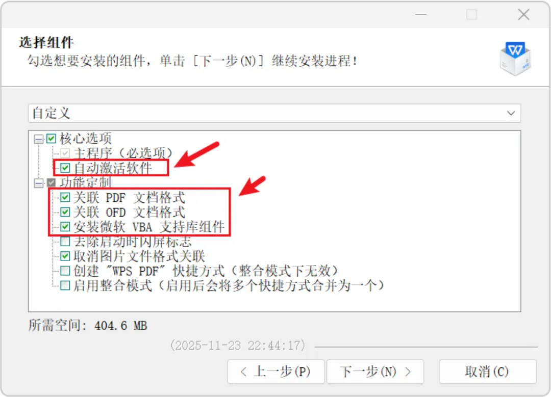 在组件选择界面,关键一步:请确保勾选上方的选项,此版本已内置自动激活功能,并支持PDF、OFD文档及VBA组件。然后点击“下一步”。