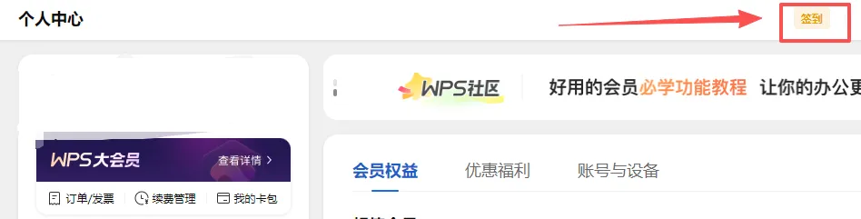 1.打开你的WPS“个人中心”→点击“签到”→进入“任务中心”→在“签到领奖励”处进行当日签到,可随机获得–积分*1、1h会员时长(超级会员,自动启用)、优惠券;第二天第三天必得会员时长,签到七天必得一天超会时长。