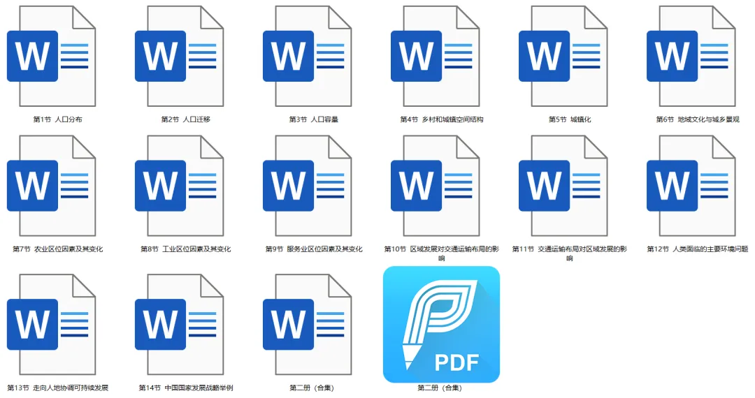 既可以一整册打印,也可以单节打印,方便大家使用!如下图:第二册(合集)Word/PDF文件,就是整本书的知识点,其余内容为单节知识。