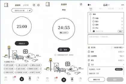 它支持专注功能,可以选择专注计划,选择之前添加的事件进行专注,支持的专注设置选项包括:默认专注时长、默认休息时长、连续专注次数、专注结束后自动完成计划、专注时屏幕常亮、进入休息提醒、沉浸模式样式。