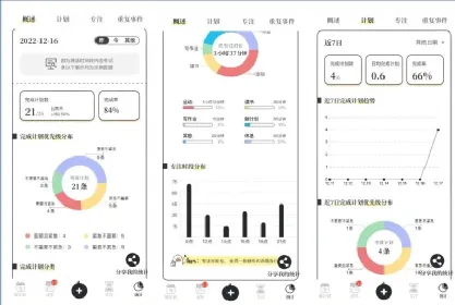 最后,它支持强大的统计功能,包括:完成计划数量、完成率、完成计划优先级分布、完成计划分类、专注时长分布、专注时段分布、专注总时长、专注总次数、重复事件数量等,可以帮助你高效复盘。