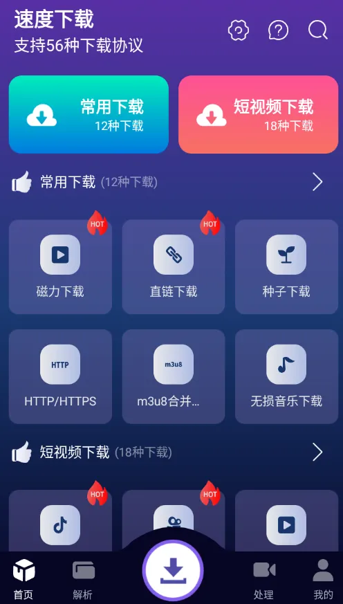 速度下载支持56种下载协议,12种常用下载、18种短视频下载,还支持国际视频下载(需要自备vpn)和一些其他的音频视频的下载。