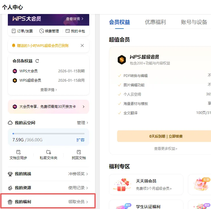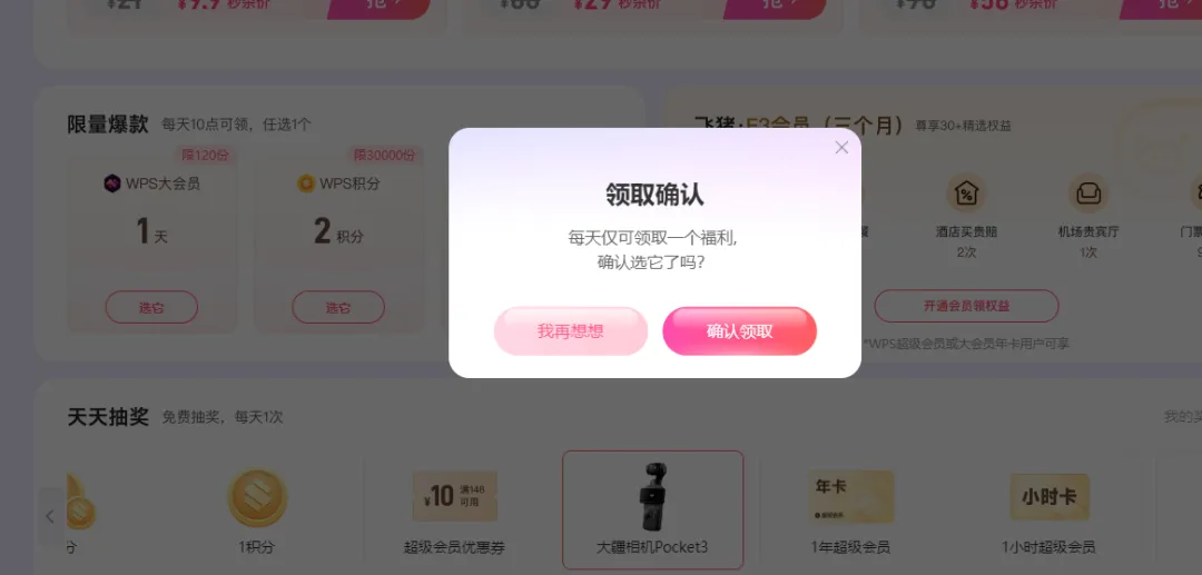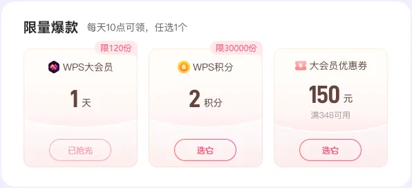 注:在我预计发出这篇文章的今天,发现此处十点领取的选项中只有“时长1h的WPS超级会员”了。