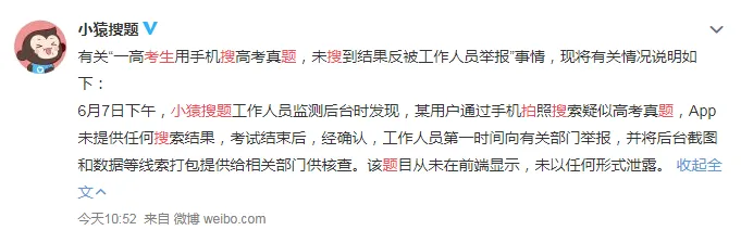 6月7日下午,小猿搜题工作人员监测后台时发现,某用户通过手机拍照搜索疑似高考真题,App未提供任何搜索结果,考试结束后,经确认,工作人员第一时间向有关部门举报,并将后台截图和数据等线索打包提供给相关部门供核查。该题目从未在前端显示,未以任何形式泄露。