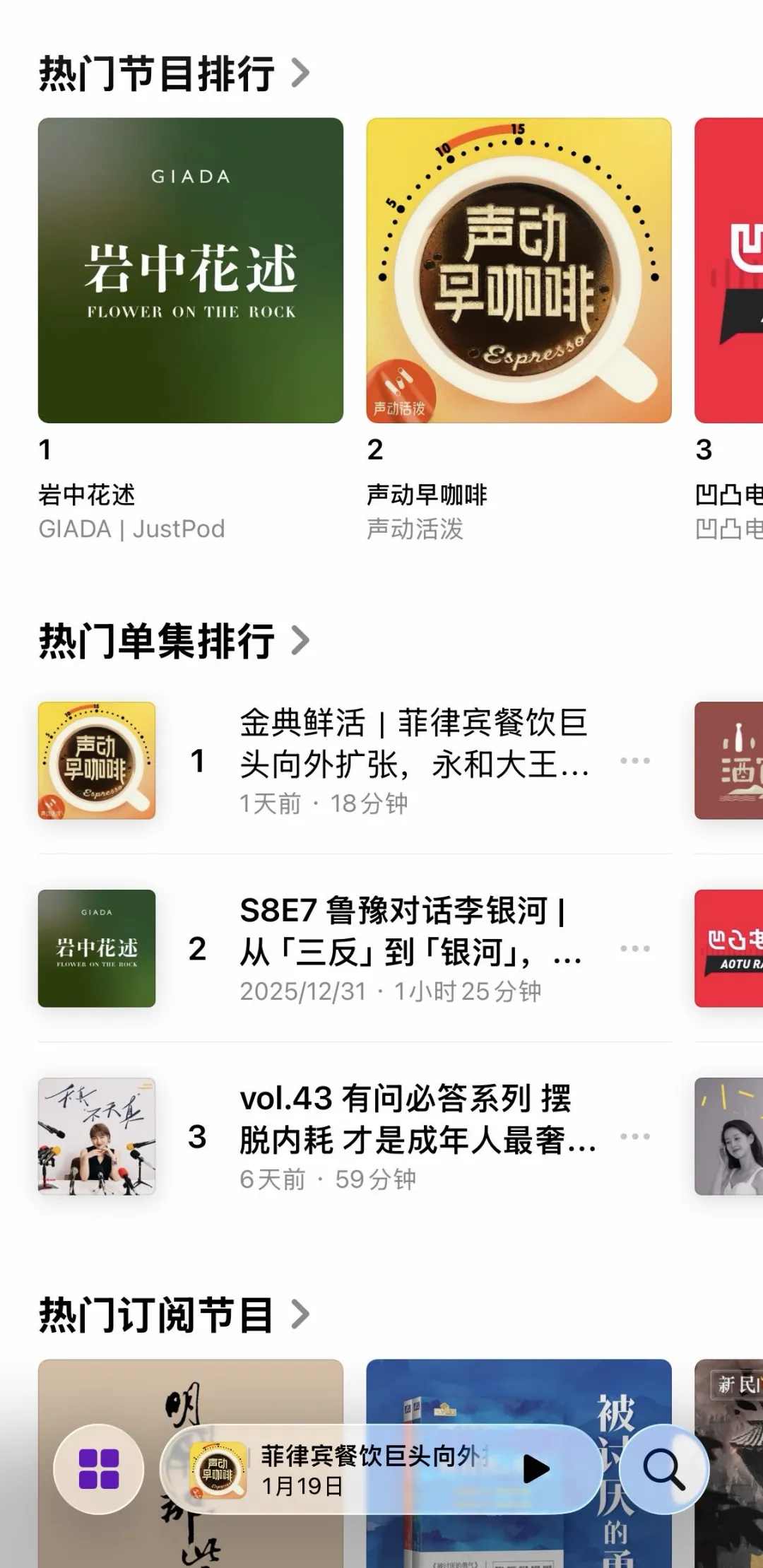 想要接触更多内容,点底部的「新发现」,可以看到很多不同热门节目,以及热门单集、热门订阅等。