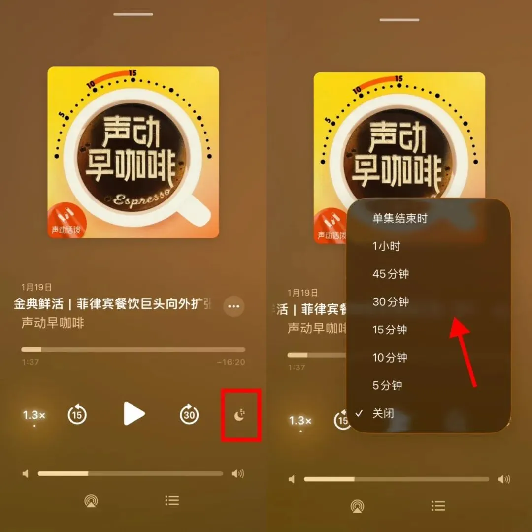 睡觉前只是单纯想听听,就可以设置单集的结束时间,点下方的「睡眠」小图标,就可以设置结束时间。