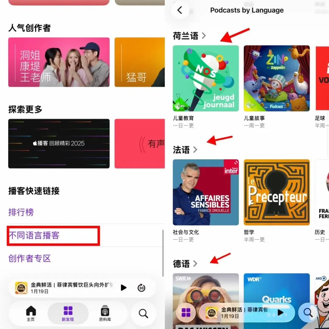 滑到底部,还可以选择「不同语言播客」,不管是想练习听力、还是想了解其他语言,或者是偏爱小众语言内容,都能得到满足!