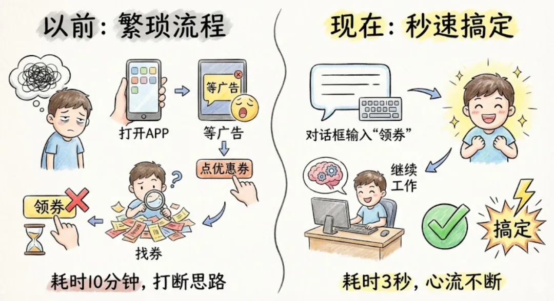这里是我在对话框里随口给的指令后,它自动帮我领取的优惠券: