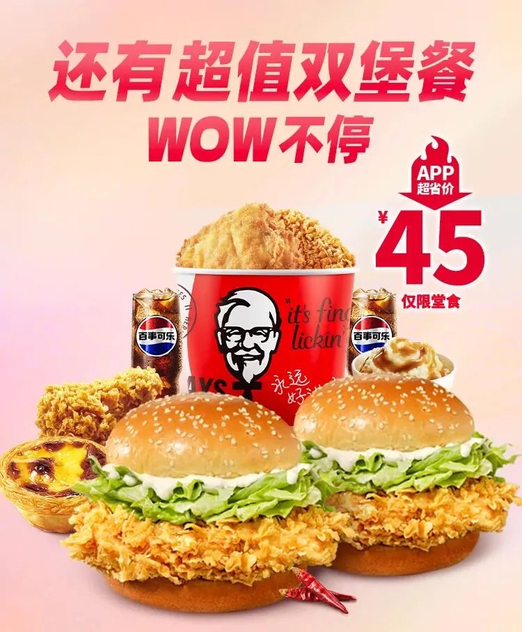 超值双堡餐(APP超省价)活动自2026年1月16日至2026年1月22日,天天可享。活动渠道:肯德基超级APP自助点餐到店自取。预约单不参加此活动。活动时段:9:30-23:00。活动地区:全国。堂食供应时间具体以餐厅实际营业时间为准,仅限有此产品供应的部分肯德基餐厅,交通枢纽、旅游景区的餐厅、精选餐厅以及西藏自治区的餐厅等部分餐厅除外,具体情况以餐厅餐牌公示为准。外送部分送餐区域不供应本产品,详情以输入地址后显示的菜单及送餐时间为准,外送费及打包服务费需自理。除推广产品外,其他物品仅做装饰目的,图示内容仅供参考。产品、周边、玩具及包装以实物为准。不与其他优惠共享。堂食、肯德基宅急送自有渠道、第三方外卖平台外送渠道、甜品站、团购渠道、企业送渠道以及其他渠道的产品组合、价格以及优惠活动,以各渠道页面展示为准。