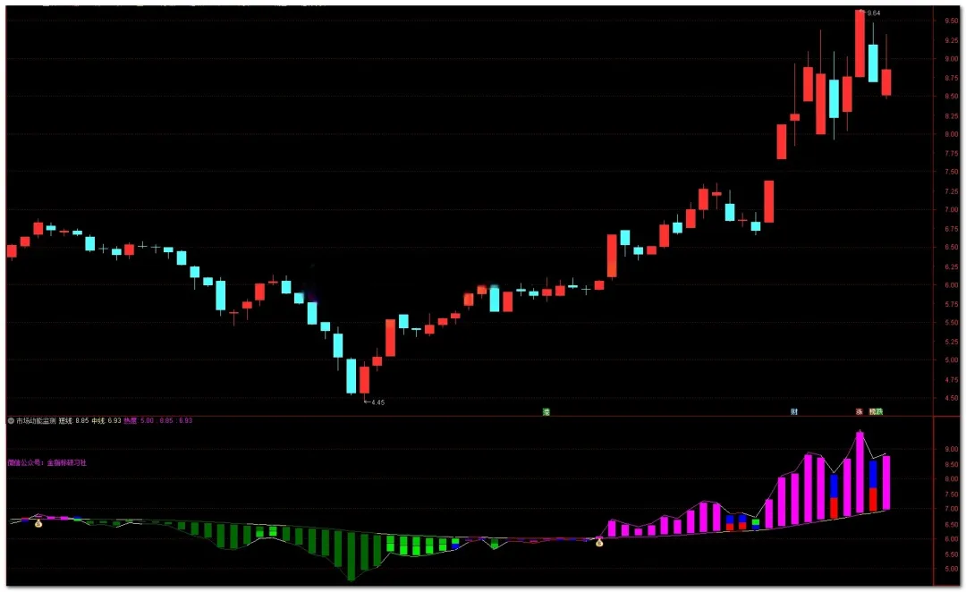 信号特征 :色带结束了漫长的绿色(下跌),开始出现蓝色甚至红色小方块。操作逻辑 :说明短期资金开始活跃,股价站上了20日或30日线,此时是震荡筑底期。操作建议 :适合喜欢低吸的朋友。在蓝色区域轻仓试错,等到变洋红再加仓。