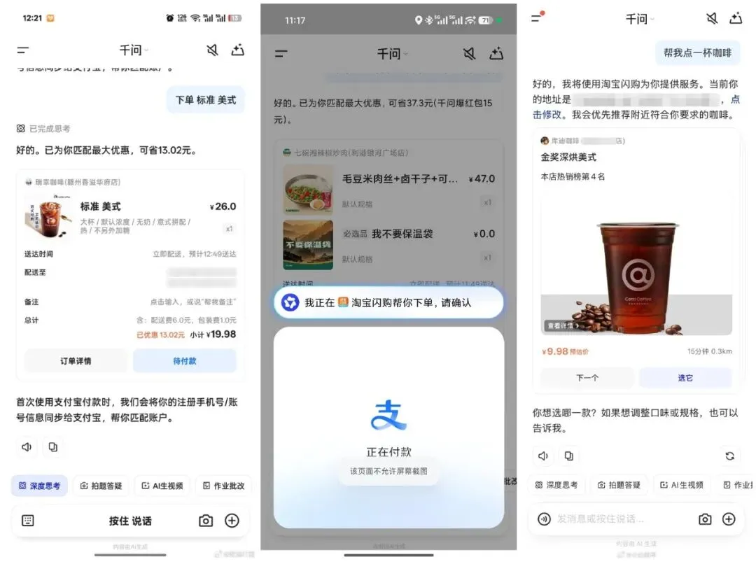 从演示结果来看,经过授权,千问就能调用淘宝闪购的服务能力,精准定位、推荐合适的商家、生成订单,并通过内置的“支付宝AI付”功能一键付款,实现“说一句,就送到”。随后网友也纷纷进行了测试,博主@小白测评买了一杯咖啡,@数码IT君点了一杯美式,@HHP良来了一份便餐,根据大家的讨论,焦点还是集中在是否有更大的优惠,是否能货比三家?有部分网友表示,和手动点单相比,千问点单似乎会贵1元左右。