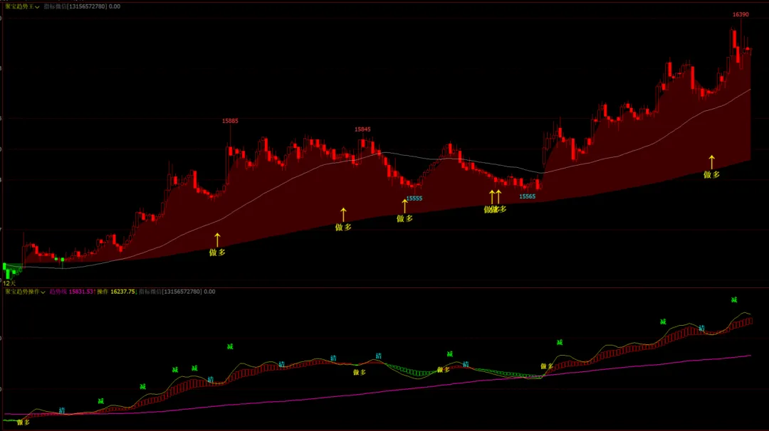 聚宝趋势操作幅图:多空红绿柱,趋势线,做多,清,减提示