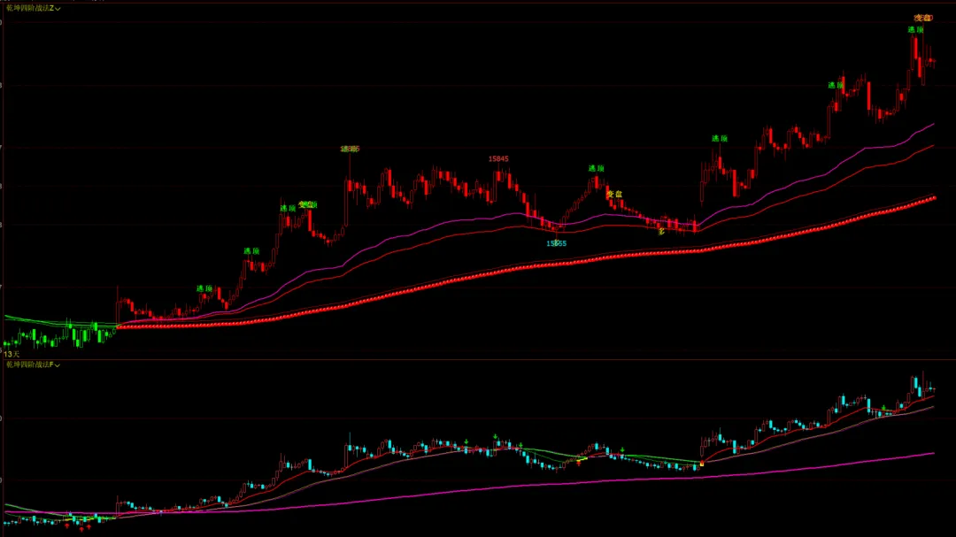 乾坤四阶战法主图:趋势线,变色多空,多空变色,逃顶,多空