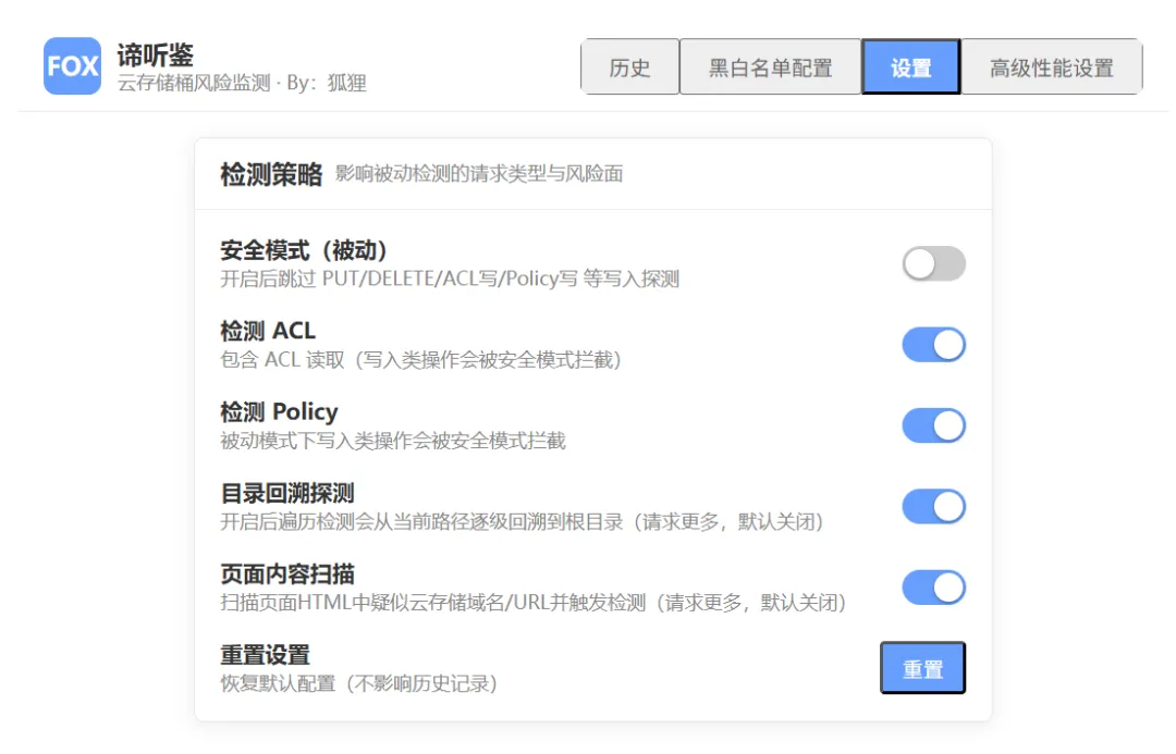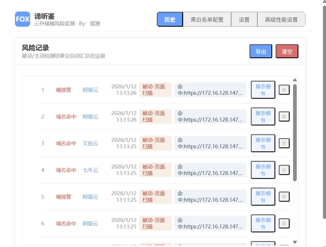 优化原项目的探测方式、界面UI修改、增加性能设置、目录回溯探测、页面内容扫描,底层逻辑优化、支持一键导入导出数据配置、右击页面可选择主动检测模式