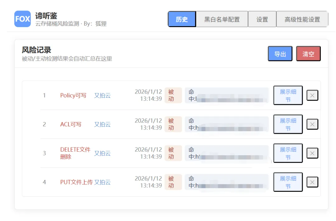 支持的OSS桶检测:阿里云、腾讯云、华为云、亚马逊云、七牛云、青云、又拍云、京东云、金山云、天翼云