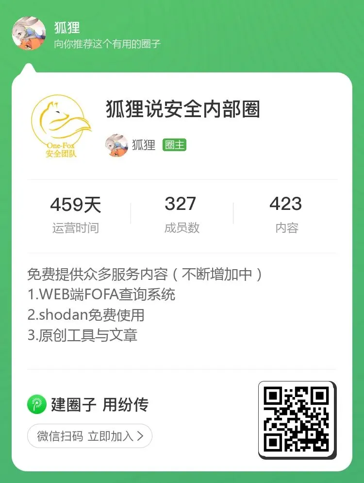 由于传播、利用本公众号狐狸说安全所提供的信息而造成的任何直接或者间接的后果及损失,均由使用者本人负责,公众号狐狸说安全及作者不为此承担任何责任,一旦造成后果请自行承担!如有侵权烦请告知,我们会立即删除并致歉,谢谢!