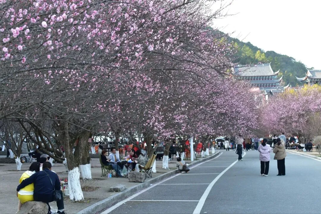 注:本词依《卜算子》正体,双调四十四字,上下片各两仄韵。词中“古寺”点出林阳寺千年古刹背景,“疏影横林路”暗合图中梅树成行、游人漫步之景。“腊月初开第一枝”紧扣时令,既合实景,亦喻梅之先春而发。“茶沸”“钟静”呼应赏梅、品茶、上香三事,末句“共此清欢处”以景结情,既写梅下欢聚,亦含禅意,契合林阳寺清幽意境。