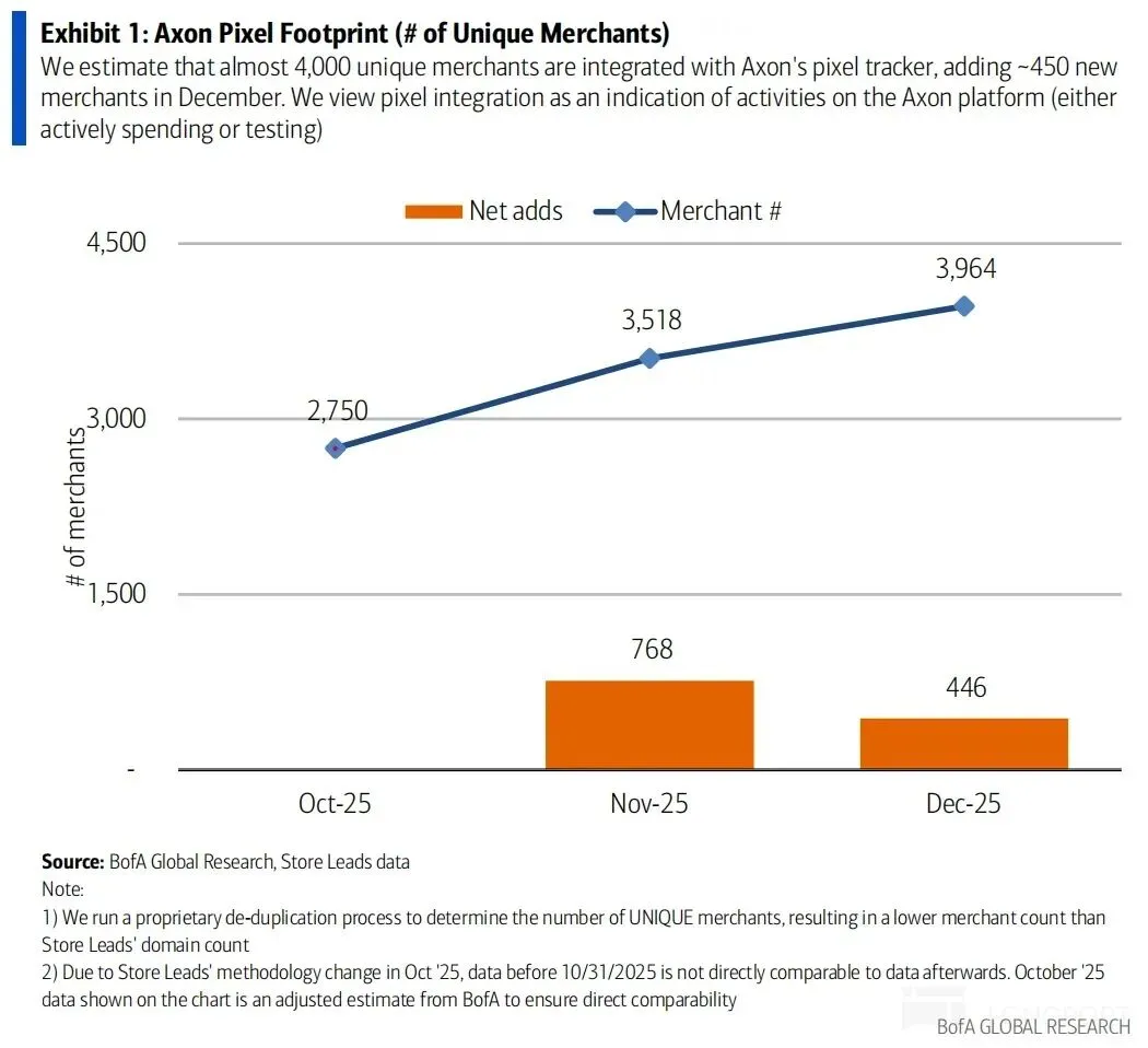 目前市场只能通过跟踪 AXON Pixel 安装数量来查看商家对 Applovin 的买量趋势变化。根据美银的追踪数据,12 月 Pixel 安装量净增 450 个用户,隐含已安装 AXON Pixel 商户达到 4000 家,稍高于其此前预期,但净增量环比下降。净增的 450 家广告主 73% 来自 Shopify,因此平均 GMV 也会相对偏小一些。