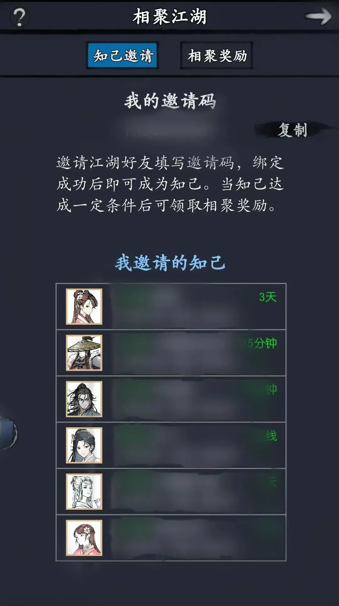 被邀请人一旦很久没上线(样本太少测不出来,至少14天以上),会自动解除知己关系并不可再接受邀请。
