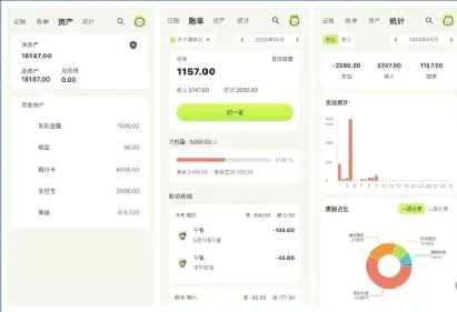 它支持预算配置、分类管理、账本管理、资产账户管理、支出收入分类管理,其中账本管理支持新建个人账本和共享账本,预算管理支持设置月预算和分类预算,支持展示剩余预算百分比。