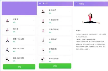 它支持瑜伽入门计划、瑜伽高阶计划、我的瑜伽计划,其中瑜伽入门计划和瑜伽高阶计划支持30天练习,完成前面一天的练习,才可以进行下一天的练习,每天的瑜伽练习包括多个具体动作。
