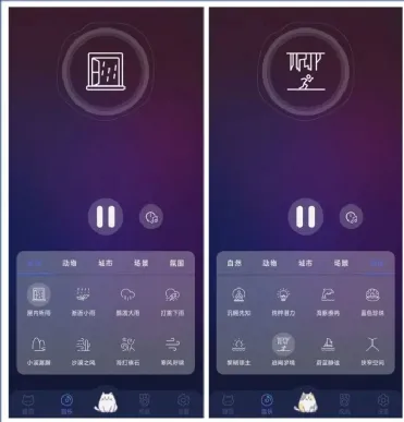 它支持40种唯美白噪音,分类包括自然、动物、城市、场景和氛围,其中自然白噪音包括屋内听雨、淅沥小雨、瓢泼大雨、打雷下雨、小溪潺潺、沙漠之风、海打礁石、寒风呼啸。