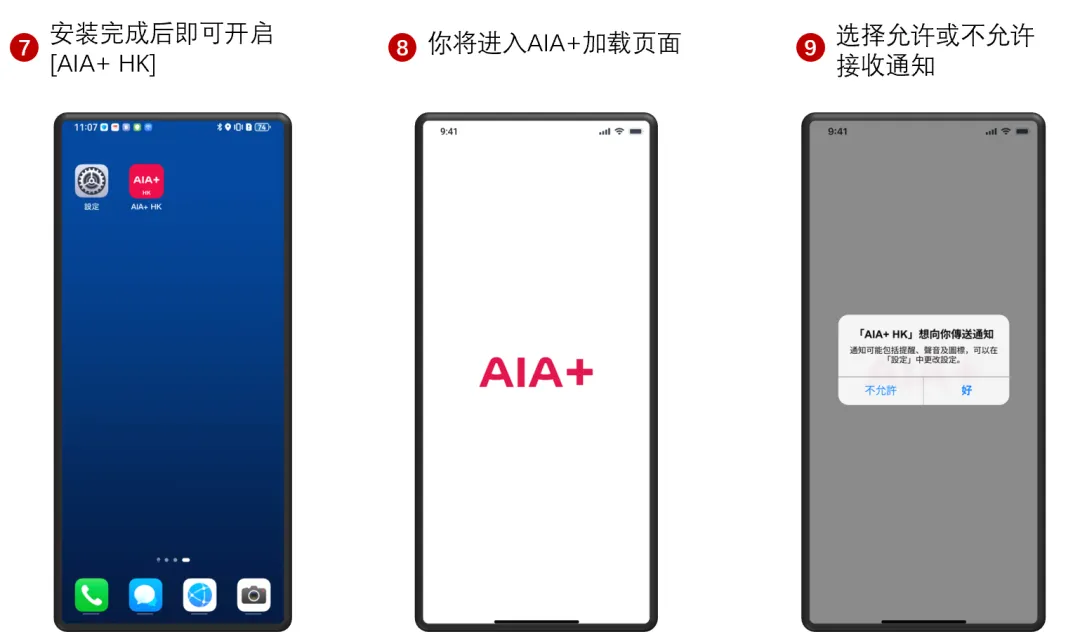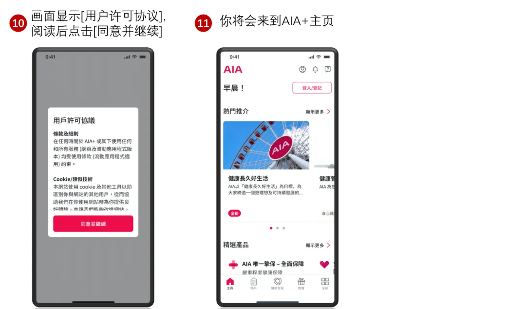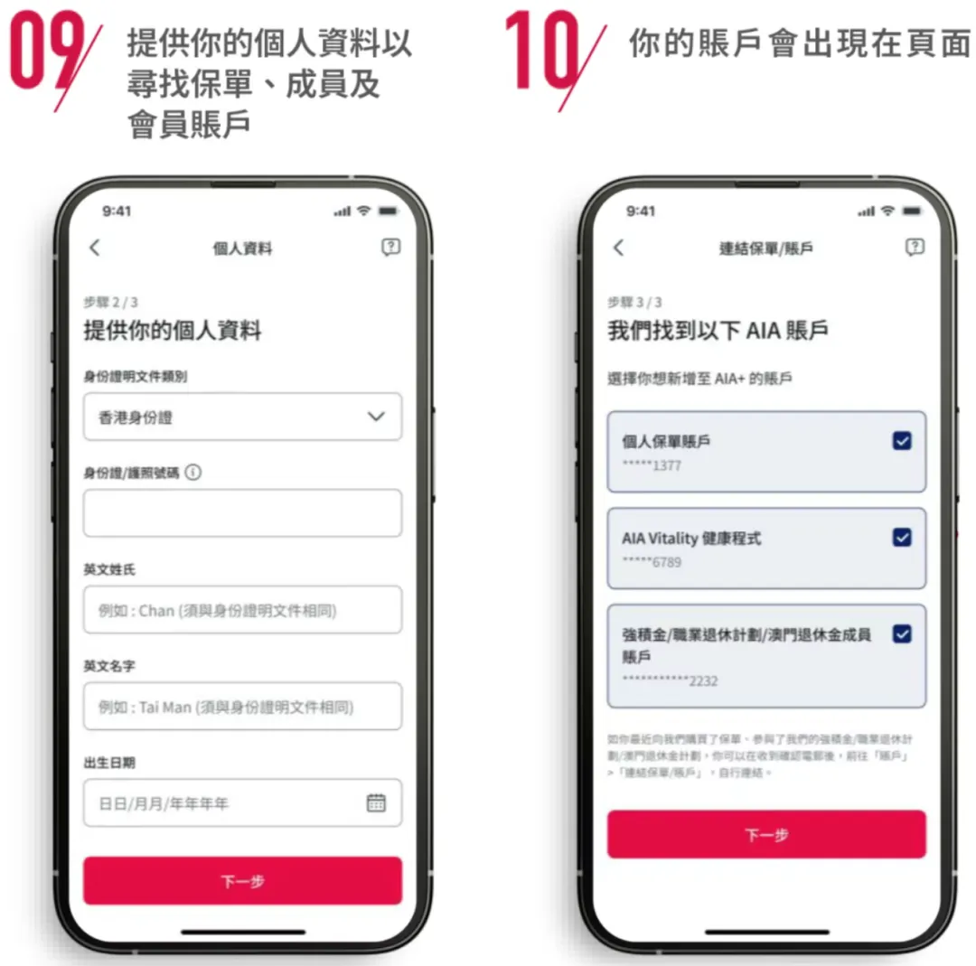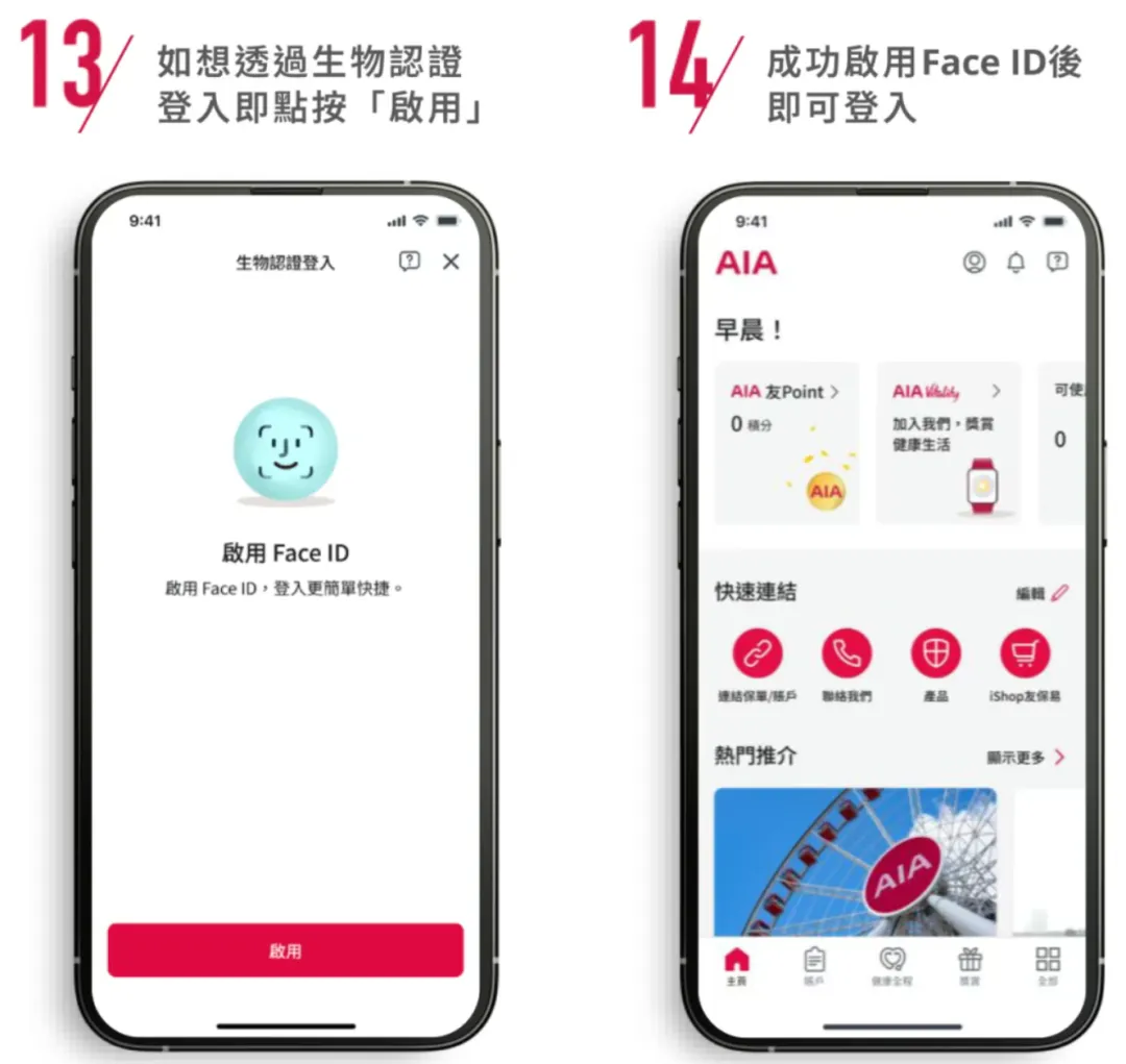 ③登记个人资料(身份证、姓名、生日)——找到AIA账户——连结所有账户——可录入Face ID,启用Face ID登入