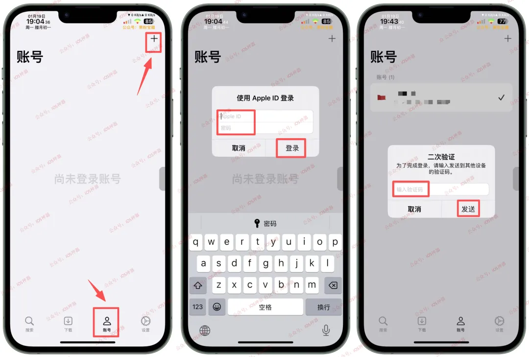 打开【DLiPA】-【账号】-【+】-【输入自己Apple ID】-【登录】