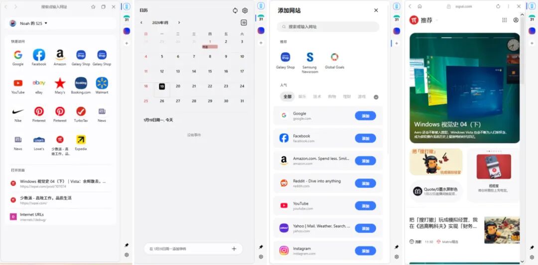 在 UI 方面。新版客户端和两年前的版本差别不大,依然保留了极具特色的侧边栏功能。其中的「已同步设备」功能可以同步手机端浏览器的快速启动页,并以移动设备模式浏览网页内容;日历功能则直接与三星账户中的日历事项同步,并支持添加 Google 账号显示 Google 日历。如果有需要,可以在侧边栏下方添加新的网址。
