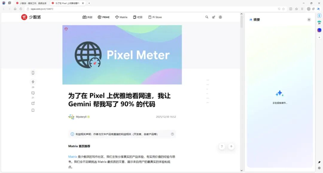 Windows Beta 版中的「浏览助手」功能包含了摘要提取和翻译功能,其中摘要提取来自于 Galaxy AI。该功能的使用效果与手机版相同,可以由 AI 总结网页内容供你参考,不过可能是由于网络或其他限制,连接云端 AI 时会报错,有条件的用户可以自行测试。