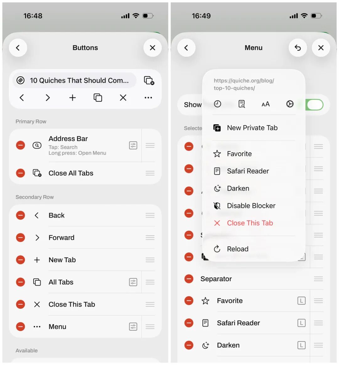 浏览器底部的 Toolbar 是 Quiche Browser 自由度最高的一个区域,但应用并没有丢给你「一张白纸」任意发挥,而是在设置中提供了 16 种布局预设,你可以根据自己的使用习惯选择其一,再在预设之上进行微调。