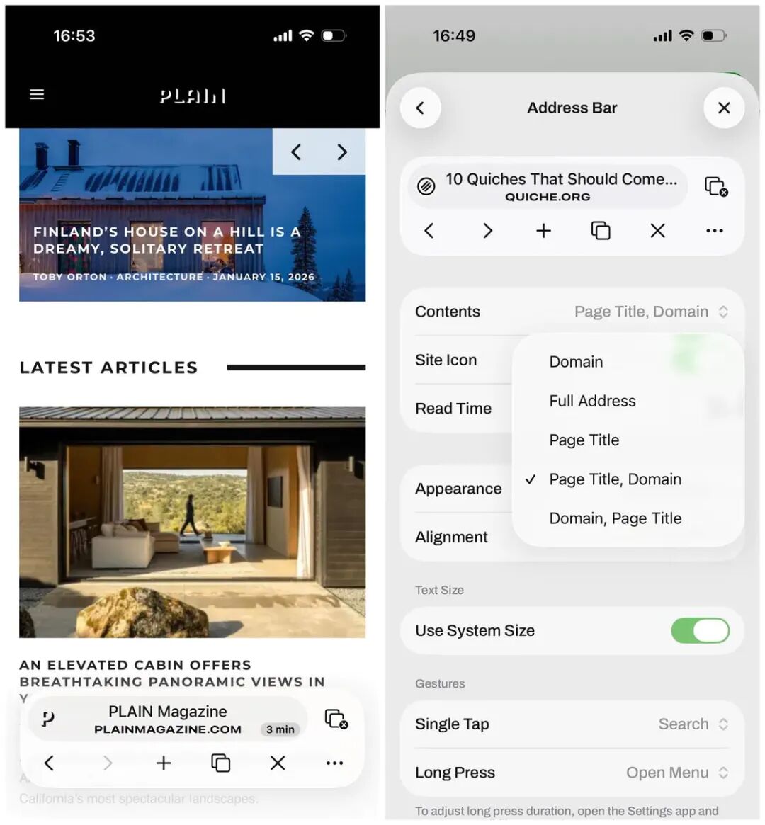 Quiche Browser 还可以对地址栏的展现进行微调,例如在地址栏中选择性展现域名、完整地址、页面标题以及网站图标,调整文本左对齐或居中对齐,展现阅读时长等。在交互上,你则可以为短按和长按地址栏设置触发不同动作,进一步提升交互效率。