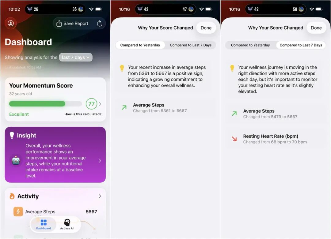 打开 Activas 后,应用会申请获得 Apple Health 的数据权限,进行简单的配置后就可以进入 Dashboard 了。在这里,我们可以看到应用对我们的身体情况进行一个综合打分,点击进入详情页还可以看到评分变化的具体原因。