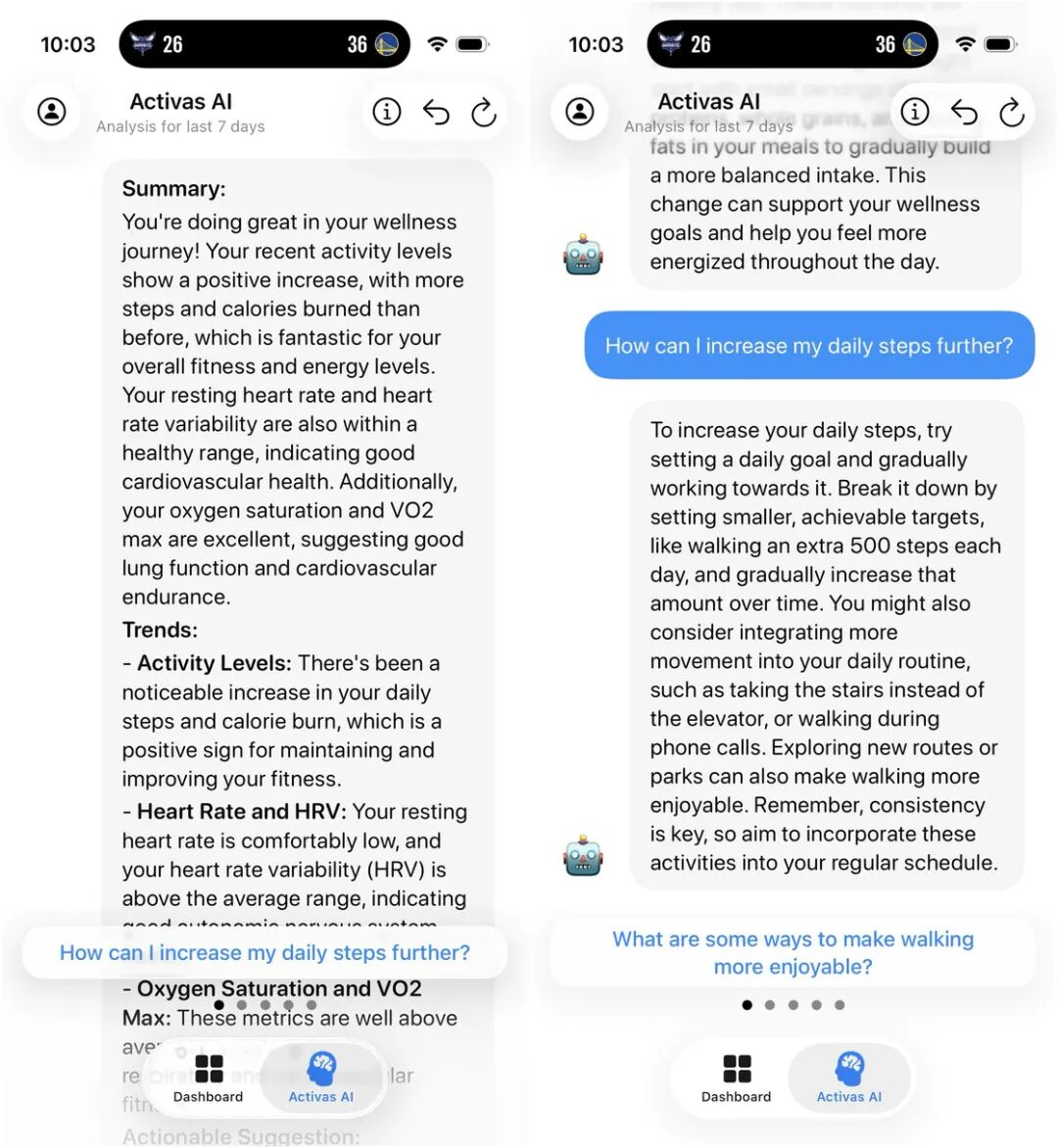 如果你已经等不及那一天的到来,也不想把自己的数据泄漏给 OpenAI,那么不妨试试 Activas 这款应用,它采用了 Apple 的 on device ML 接口来进行数据分析,可以基于我们的健康数据给出对应的建议。