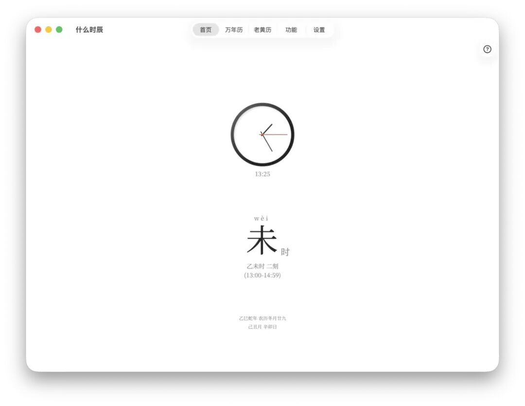 什么时辰,从应用名就不难看出,这款应用强调的是中国传统计时方式。打开应用首页,就可以看到时钟以及对应的时辰,还有农历上对应的月份和日期,并且应用还进行的标注的每一个时辰的拼音注脚念法,比如当下是「未时」,就在「未」上加注了拼音 Wei。