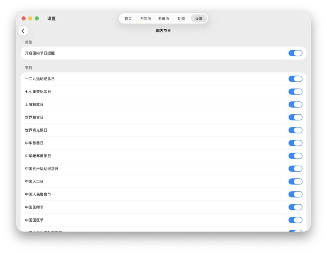 以 Mac 版为例,通过顶部的 Tab 页,你可以切换到不同的日历类型中,比如万年历部分除了可以以月的形式查看日期之外,还可以看到对应的农历信息、黄历的今日宜忌以及近期的 24 节气和节假日信息,切换到日历事件则可以读取 macOS / iOS 的系统日历事件信息。