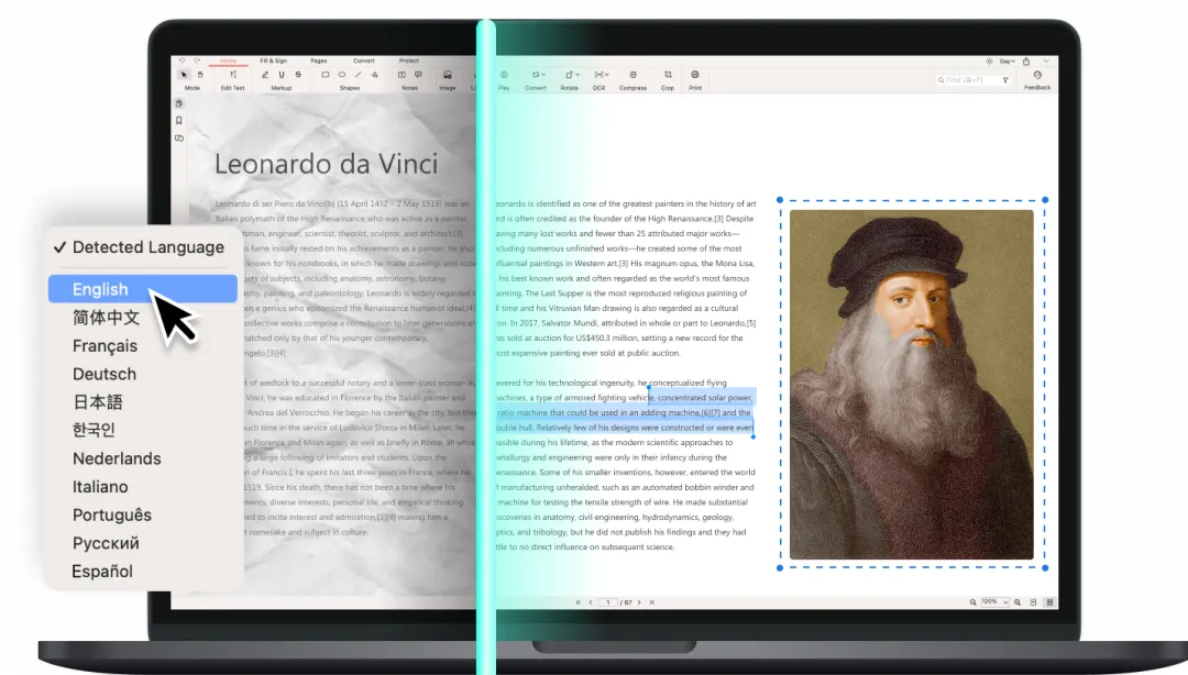 这个功能特别实用!PDFgear能够精确地从扫描的PDF或图片文档中提取文字内容,支持包括中文、英文、日文等30多种语言。无论是扫描的合同还是图片中的文字,都能转换为可编辑的文本。