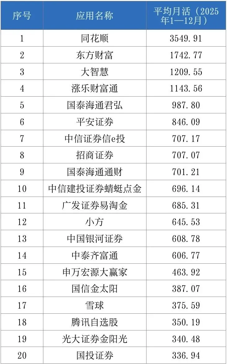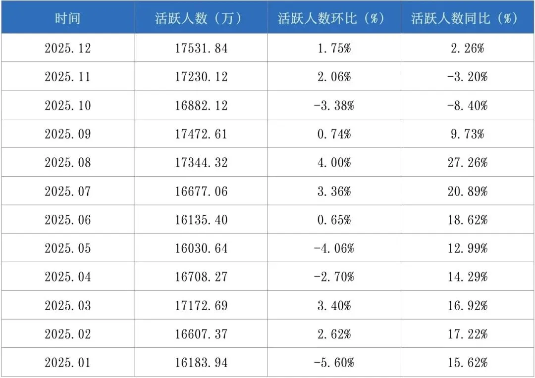易观千帆最新数据显示,2025年12月份,证券类App月活跃人数达1.75亿,环比增长1.75%,同比增长2.26%,创下2025年单月新高。